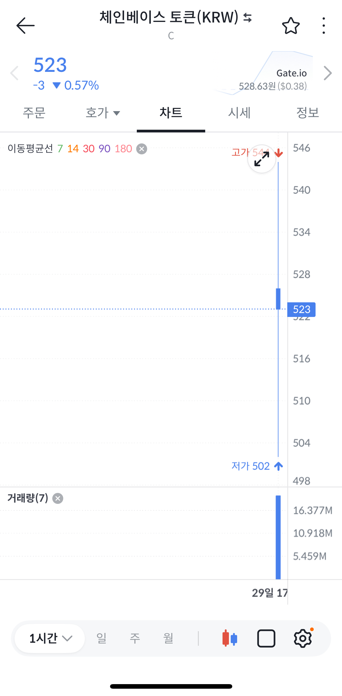 체인베이스 토큰 클릭 > 시장가 > 5,100원 금액매수 > 매도탭에서 시장가 전량 매도 클릭 > 끝!!