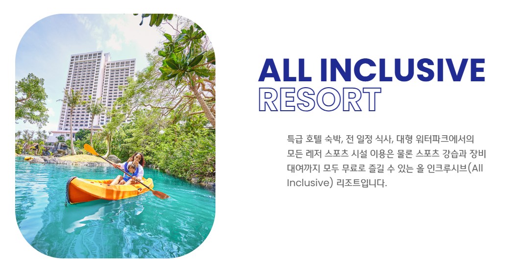 - 특징 : 올인클루시브형 리조트 / 식사/레저/워터파크/프라이빗 비치까지 한 번에 해결 가능! (★이게 제 선택의 이유!)
