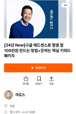 제가 원하던 초기 자본없이 가능한 부업이라고 생각해서 CLASS101 의 연간 코칭권을 구매 후 아로스님의 “구글 애드센스로 평생 월 100만원 만드는 방법” 강의를 23년도에 듣게되었어요.