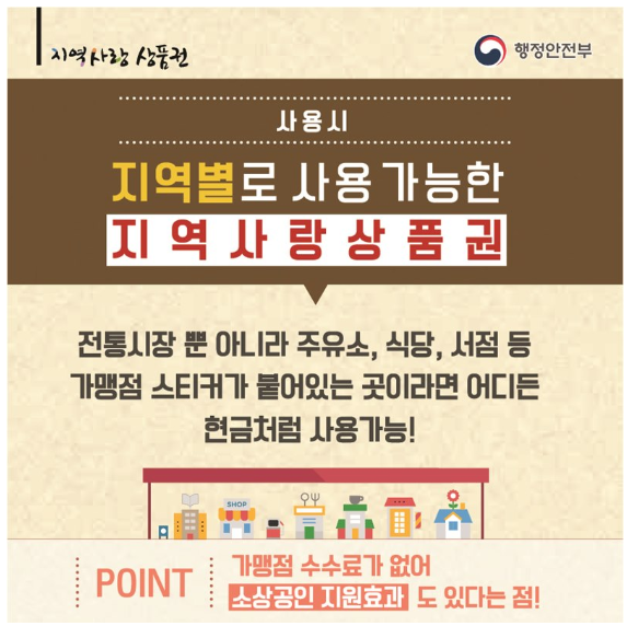 | 사용 가능처 | 지역사랑상품권 가맹점, 제로페이 가맹점, 연계 체크카드 가맹점 |