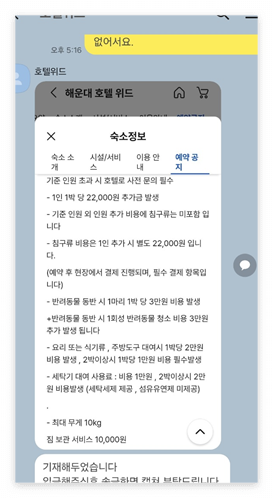 아무리 찾아도 숙박 상세 정보에는 추가 비용에 대한 정보가 없어서, 문의를 드리니 '숙소정보'란에 기재가 되어있다고 하시더라고요.