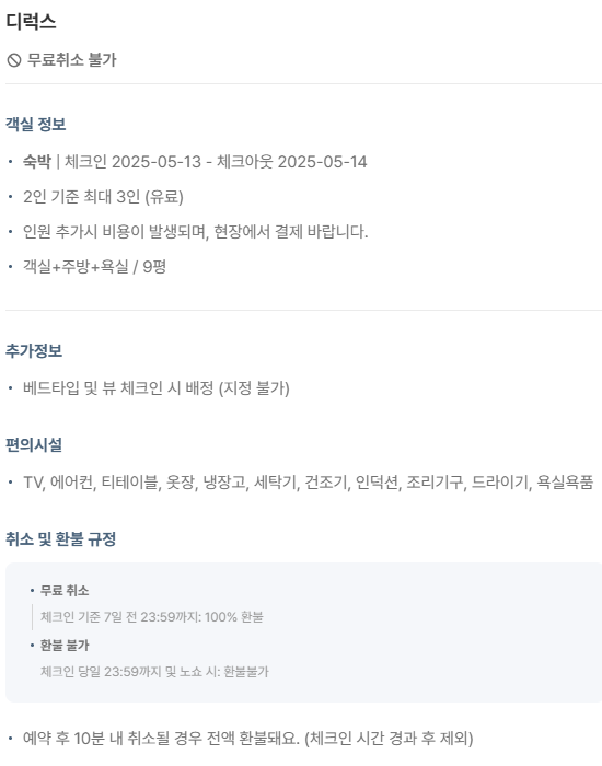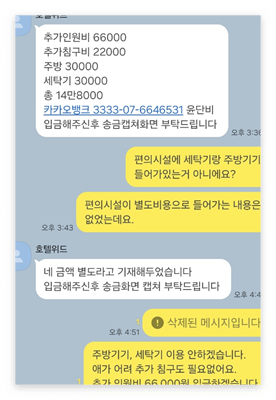 - 야놀자에서 제공 한 상세정보에는 2인 기준 최대 3인(유료) → 1인 추가 숙박비 표기 안됨 + 침구 무조건 추가 해야하는 부분도 언급 없었음