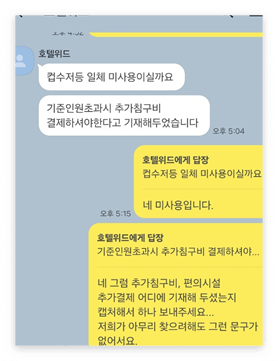 저처럼 '속았다.' 하는 느낌을 받는 고객은 없었을 것 같아요. (이러한 안내 방법이 야놀자 플랫폼의 문제인지, 호텔위드 관리자의 운영 방법인지는 잘 모르겠지만요.. 다시는 이런 경험을 하고 싶지는 않았습니다.)