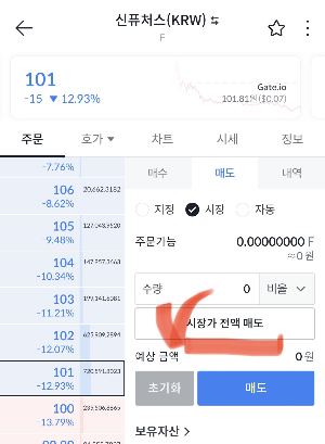 최소주문금액이 5천 원이기에 5,100원으로 시장가 매수 > 매도탭에서 현재가 전량 매도!!