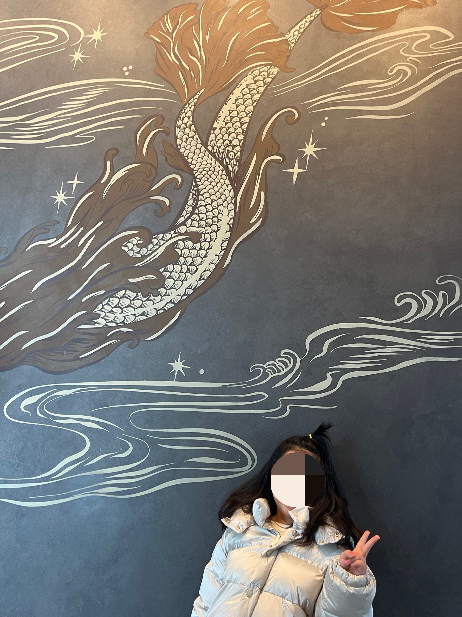 1층에서 2층으로 올라가는 계단 옆에는 벽화가 예쁘게 그려져 있는데요, 첫 째 아이가 냉큼 앞에 서서는 포즈를 취하더라고요 ㅎㅎ