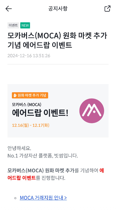 빗썸 모카버스(MOCA) 에어드랍 이벤트