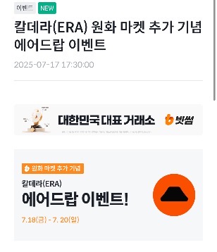 대한민국 대표 가상자산 거래소 빗썸에서 새로운 원화마켓을 추가했습니다. 바로 **칼데라(ERA)**인데요, 이번 상장 기념으로 총 750,000 ERA를 에어드랍하는 특별한 이벤트가 열립니다!