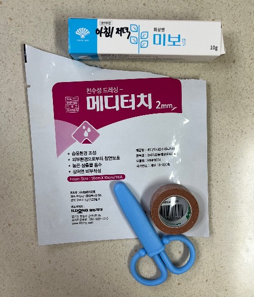2. 아침, 저녁으로 상처 부위에 연고 발라주고, 메디폼 부착