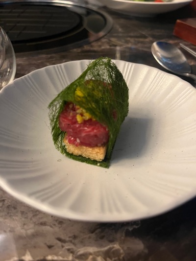 맞이샐러드 > 4가지 찬 > 체리토마토 마리네이드 > 한우 육사시미 > 한우 육회(C코스는 우니 추가) > 한우 우설 수육 > 한우 모듬 구이 > 저염명란 > 비프 타다끼 > 식사(들깨미역국, 밥) > 디저트(오늘의 푸딩)