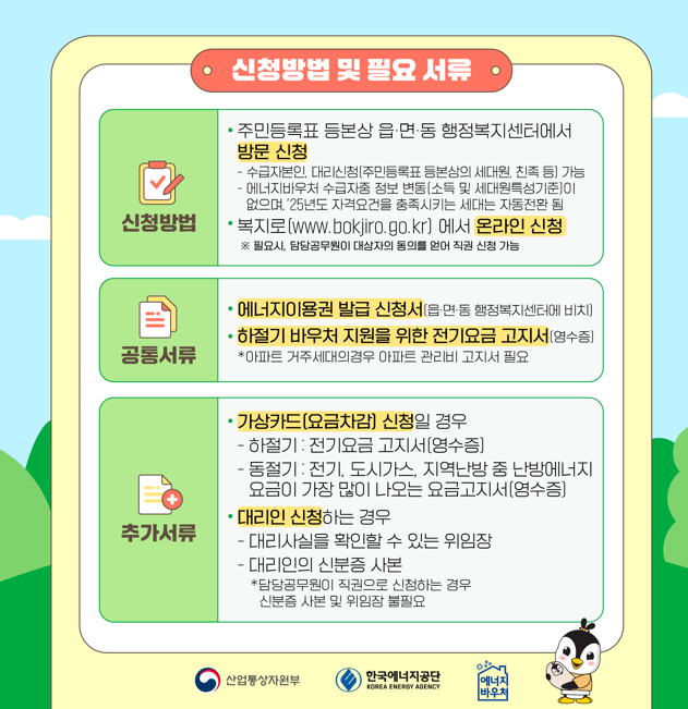 - 지원 형태: 전기요금 차감 또는 에너지 구매 카드