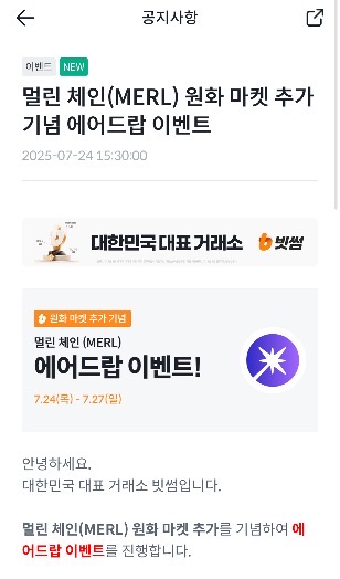 그런데 이번에 빗썸에서 MERL(멀린 체인) 상장 기념 에어드랍 이벤트가 열렸는데요,